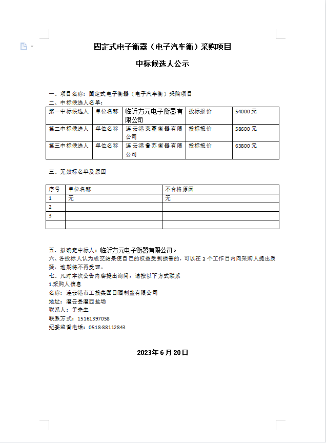 固定式電子衡器(電子汽車衡)采購項(xiàng)目 中標(biāo)候選人公示